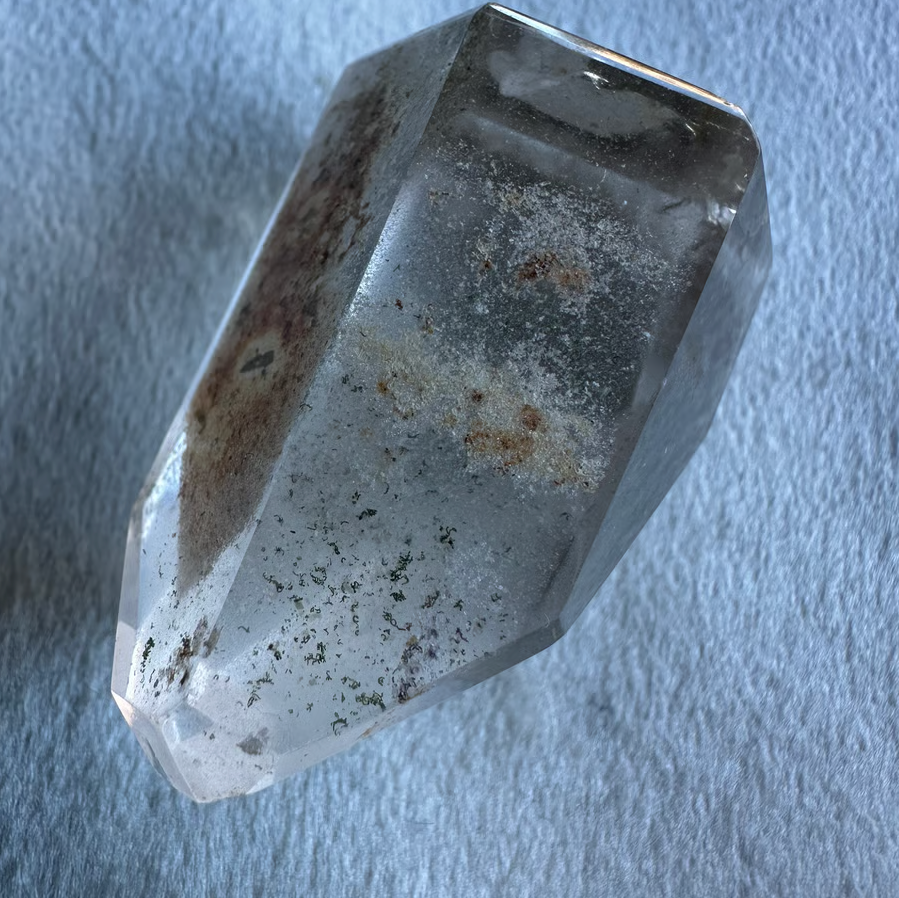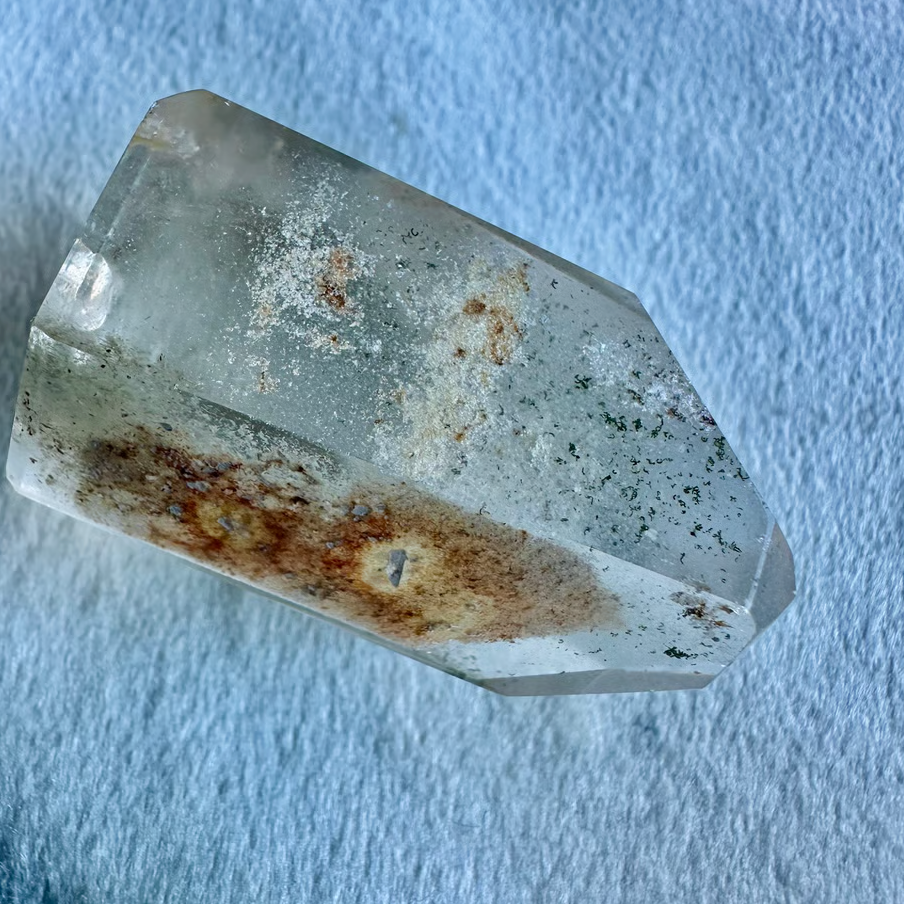 透明な水晶の中にヘマタイト・クローライト・ルチルなどが内包された神秘的な石で、