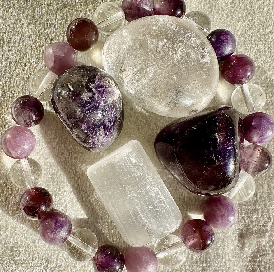 クラウンチャクラ(第七チャクラ)に対応する高波動ストーンを組み合わせ、スピリチュアルな感性と心の安定をサポートするブレスレットです。